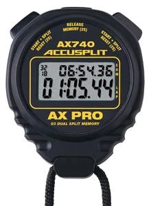 The AX740 offers a Dual display and saves the first 50 splits in the recallable memory with a split counter to 99. It is available in Black only. With the CR2032 Lithium battery, it has a 5-year expected battery life. The AX740 is water resistant (up to 30-meters), and is shock resistant. The perfect memory stopwatch for all of your timing needs.