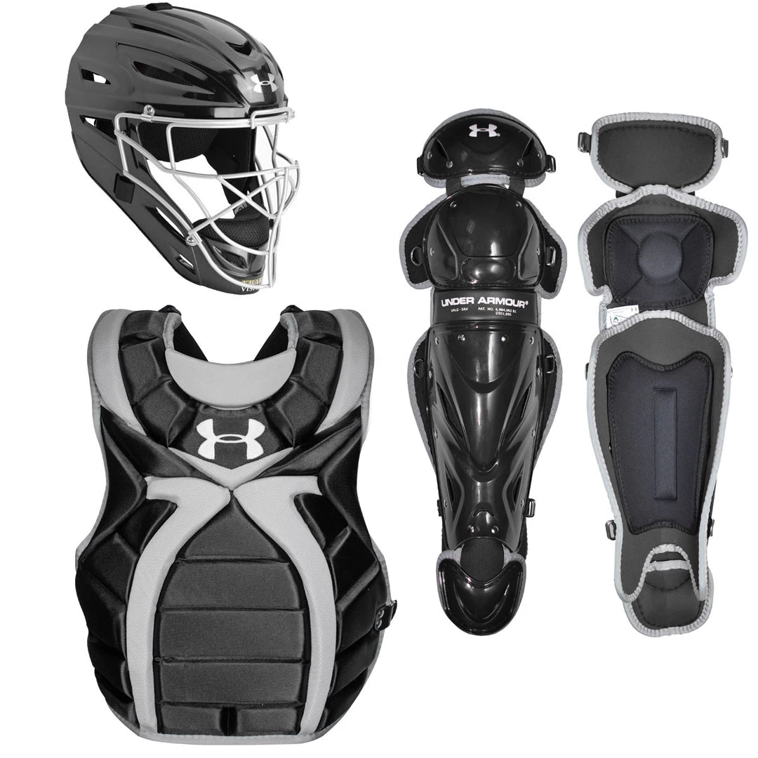 This Under Armour set of Victory Series Catching Equipment contains all items needed to take the field with full protection! Set includes catching mask, chest protector, leg guards, and even an extra throat guard.