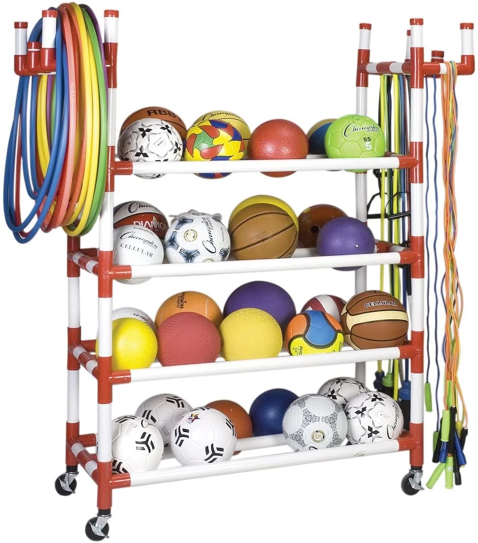 The Champion Sports P.E. Equipment Storage Cart safely and effectively transports all of your equipment. This versatile cart holds up to 32 basketballs, 40 soccer balls, or 40 playground balls, 48 hoops, and up to 150 jump ropes! This durable plastic cart will ensure that you wont need to hassle with multiple storage racks, lockers, and trees again. This all-in-one equipment cart features 3in diameter ball bearing swivel caster wheels, so you can transport your gear wherever you need it most. The P.E. Equipment Cart is perfect for any classroom or recreational club.