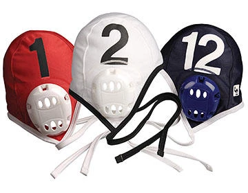The Water Polo Caps are made out of a durable nylon material that comfortably conforms to any head shape. Secured to the head with a nylon tie, and equipped with strong plastic ear guards for protection during game play.The Water Polo Caps are sold in sets, numbered 1-13 (Extension Cap Sets available 14-26). Player Number appears in three locations, both sides and top of cap. Sets are available in White or Navy team colors and includes 2 Red goalie caps.
