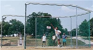 This Pro-Down Discus Cage With Ground Plates features six 11 feet high (3.3m) galvanized steel upright posts that are angled at the top for added protection. The surrounding net is constructed from 200 pound. test, 1-3/4 inches (4.4cm) weather-treated nylon mesh. The top of the net has grommets every 24 inches (60cm) with special, easy clip-on hanging hooks. A replacement net with the same construction specifications is available separately. Meets all NFHS specifications. Search Pro-Down Discus Cages for more options.