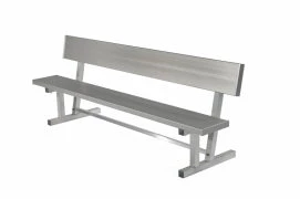 Team Bench with a 2×12 clear anodized seat plank and 2×10 backrest on a double leg 2″ square tube aluminum frame. Designed for easy mobility.