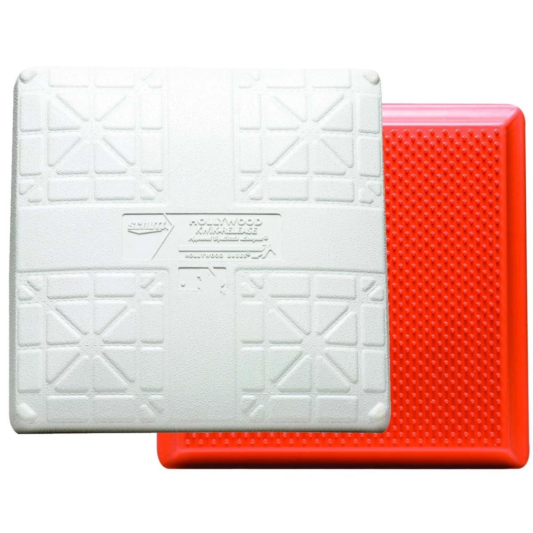Schutt Hollywood Impact Kwik-Release youth bases are the official recommended base of the Babe Ruth League and Cal Ripken Baseball and is approved for Little League play. The patented design compresses upon impact like other Hollywood impact bases however, for additional safety, the top of the Kwik-Release base will disengage upon strong enough impact reducing the chance of injury. The youth design has a lighter resistance to disengage the base than the adult model. The bottom of the base features a waffle-design that adds strength and flexibility. The soft orange tabs on the platform hold onto the top of the base but are soft enough for players to slide over.