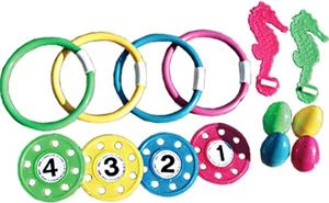 The Family Fun Pack is a set of various dive toys to improve breath control and promote underwater swimming skills. The toys are sold in a set which includes 4 dive rings, 4 dive discs, 4 turtle eggs and 2 sea horses. The entire set comes packaged in a clamshell.