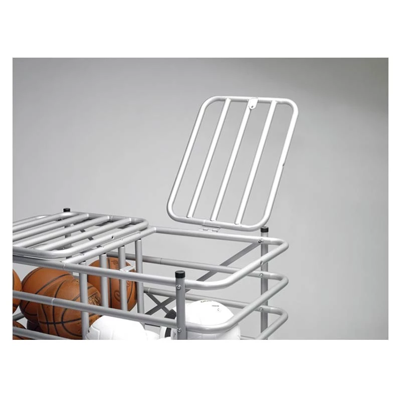 - This cage is divided into two compartments to allow for storage and transport of balls from two teams or sports